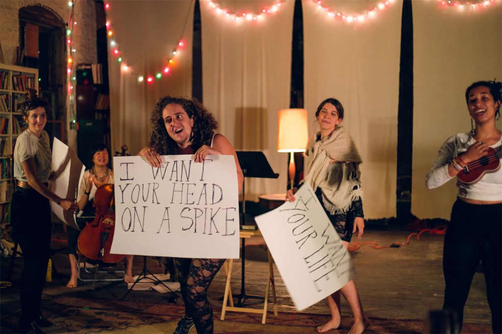 Wig Wag is a hybrid music-theater piece, performed by a cast of four in collaboration with the entire audience. In Wig Wag, singing together transforms everyone present into one collective body, as we explore the tensions and pleasures found in the thick tangle of our interdependence.